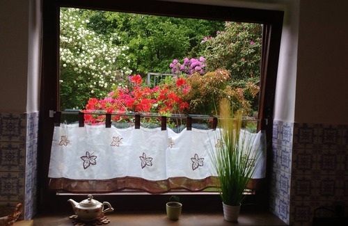 From the 55 m2 large balcony or through the panoramic windows you can enjoy the wonderful view. Sometimes you also see a deer or a raccoon. Dive into a wilderness full of rare plants and countless rhododendron bushes, they smell the wonderful scent of the snowball and watch birds, such as jays. Once they have climbed the long stairs, they can let off steam on the newly created barefoot path, the multi-generation playground or in the forest swimming pool. If you want to be quieter, have a look at the game reserve (400m). Furthermore, you will find a cafe, countless, charming hiking and biking trails. The charming half-timbered town is located about 1.5 km away.
