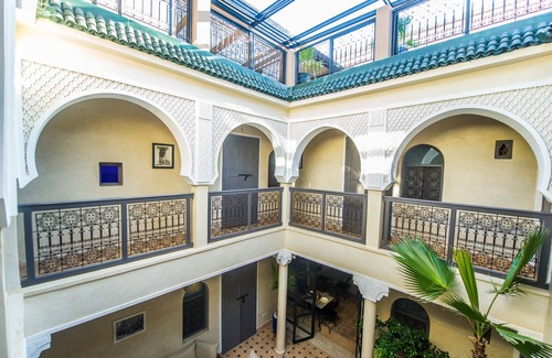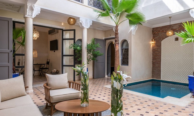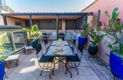 Our Riad in Marrakesh offer comfort quiet and friendly atmosphere and is composed of 3 spacious and typical suites and 4 rooms. all equipped with air-conditioned and private bathrooms, a courtyard with swimming pool to cool off. A massage room for care. Moroccan lounge with fireplace to relax with a mint tea. a sun terrace with Berber tent in front of the panoramic view of Atlas and the Medina of Marrakesh...