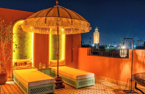 * Panoramic terrace: is a real gem. With 360° views of Koutoubia Mosque, La Mamounia Hotel, and the majestic Atlas Mountains, it's the perfect place to enjoy breakfast at sunrise, sunbathing, or a romantic dinner under the stars.