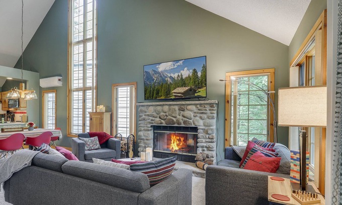 Great Room - Wood burning fireplace (wood provided), 65 inch smart TV (with a MantleMount system that allows you to lower it to eye level-even while using the fireplace), multiple couches and seating options, free book library, games and puzzles, LED candles, bluetooth speaker.