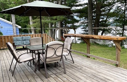 Newer listing. Our Beautiful lakefront home for your vacation. Relax, sun, jump into the water to swim, fish, and have a cool drink on your own private dock. Watch sunsets on your own huge deck overlooking the lake. Have your meals on the deck, or in the new screened in room that also looks over the lake. (or inside at the large kitchen table). Plenty of space be together, as well great space to be alone for some "me" time. All new, fully stocked custom kitchen and new appliances. Super clean. Private front & back yard to play. Huge Anderson windows facing the entire lakefront side of the house. Walk to town for ice cream, groceries, restaurants and quaint shops. Tremendous views. Outdoor bench swing to relax and dream. Also a large hammock swinging in the trees overlooking the lake. Full A/C if it gets too warm. Cozy sofas and chairs. Private office space with desk. Fast, fast internet. Walk to fun playground park for kids. So much more. You will not be disappointed!
