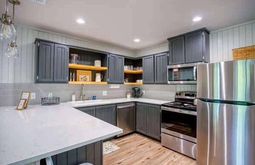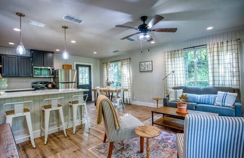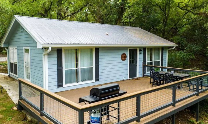 B's Bunkhouse is a charming multi-level cabin located in the Texas Hill Country, featuring 2 bedrooms and 1.5 bathrooms, making it perfect for families or groups. The open floor plan includes spacious living areas and a fully equipped kitchen, complemented by stunning outdoor spaces with views of the Blanco River. Essential amenities such as parking, laundry facilities, and WiFi ensure a comfortable stay close to local attractions.