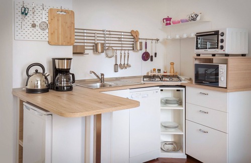 This apartment has space for 3 people (2 in the bedroom, 1 on the sofa bed). The kitchen has everything you will need, in the bathroom there is a washing mashine.