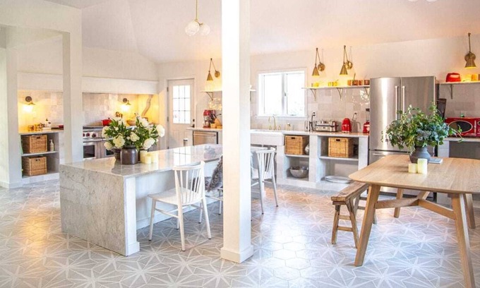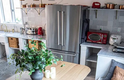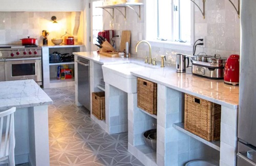 The custom designed show kitchen has a 6 burner wolf range with a griddle, grill & two full sized ovens. There is also a waffle maker, microwave, stand mixer, blender, dual steamer, rice cooker, pots and pans and all essential kitchen needs.
