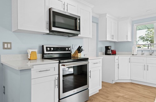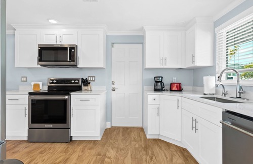 Step inside this modest, bright home and unwind in the open living room with plush seating and a smart TV for your favorite streaming shows. The full kitchen is equipped with stainless steel appliances, cookware, utensils, and everything you need for prepping snacks or meals at home. A nearby dining table offers space for casual meals, game nights, or planning your next day’s adventure.