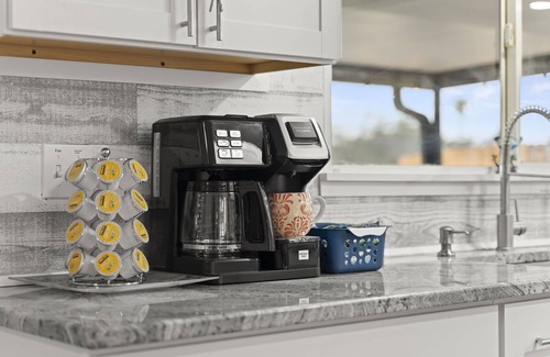 A: We have a Hamilton Beach FlexBrew 2-in-1 Coffee Maker that is compatible with K-cup pods. We’ve provided some pods for your convenience. Additionally, we also have Kirkland Signature 100% Colombian Coffee (Dark Roast), ground coffee, and filters available for use.