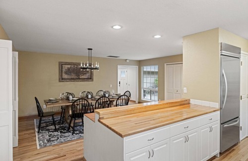 Carmel Valley's River Retreat kitchen opens to the back deck, conveniently close to the gas bbq grill, a Traeger Smoker/Grill and Hot Tub. A workstation for those who must work remotely is located by the sliding door.