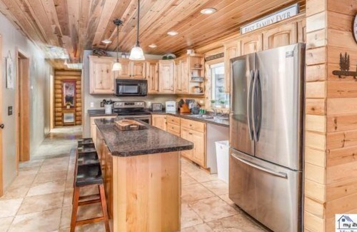 The cabin is fully equipped with all the amenities you need to feel right at home, including a large refrigerator, stove, double oven, microwave, coffee pot, pots, pans, dishes, cups, silverware, crock pot, basic spices, and more. The kitchen has a large table with a long bench and four chairs, and the living room features a sofa, swivel chairs, and a large dining table, perfect for family games. Step outside to the covered deck and take in the stunning views from the rocking chairs, or cozy up by the fireplace inside.