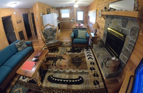 River front log cabin in Townsend, Tennesssee. 2 bedrooms with queen beds to comfortable sleep 4 adults , 1 bath with tile shower . Fully equipped kitchen, electric fireplace, flat screen TV, Internet, front and rear covered porch with swings, charcoal grill and great river frontage with tubing and fishing from your yard. Riverside firepit