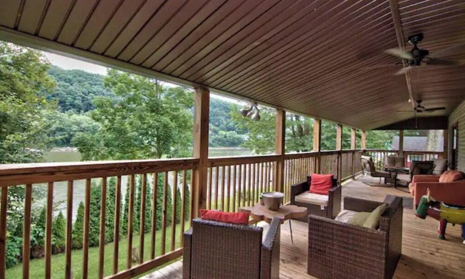 FULL ACCESS Including: super fast wifi and a 55" HDTV and all the comforts of home. All portions of the lot including off street parking, for 4 cars, patio beneath dwelling riverfront access from dwelling. Additional nearby park with grills picnic tables, basketball court, jungle gym, small zip line and covered picnic tables. Access to kayaks, paddle boards, rafts, fishing equipment and grill. Home has ductless air conditioning and a beautiful porch/balcony overlooking the river.