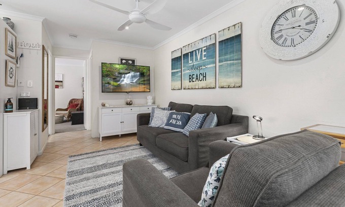 Comfy 2 bedroom air conditioned open plan kitchen/dining/lounge with Airconditioning and ceiling fans throughout. Sliding doors to a large 60m2 private courtyard complete with large outdoor lounge setting and electric easy to use BBQ. The fully equiped kitchen has a stainless steel oven, electric wok, ceramic cooktop, dishwasher and microwave. Fast WiFi, two flat screen TVs and small Bluetooth sound system are included. There is an extra powder room for your convenience.