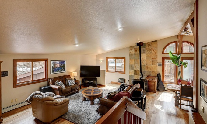 Spacious and historic Mountain Home sitting near the banks of the relaxing middle St. Vrain Creek. This is a remodeled lodge, that has converted the original bandstand into the primary bedroom and the old dance floor into the living room. This property includes a large wet bar, kitchen with utensils/equipment and large bedrooms.
