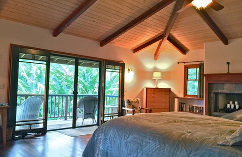Buddha said that when you can see 100 shades of green, you have truly reached heaven. This is the feeling you will have at Hale Kuleana, our beautiful tropical jungle paradise home nestled in the Wainiha River Valley. Lush vegetation surrounds you in all directions, with an unobstructed view of the sights and sounds of the Wainiha River. The 2 bedroom, 2 bath house is private, comfortable, and a perfect place to relax, reflect and rejuvenate. The 600 square foot master suite on the second floor has its own tub, shower and lanai. Downstairs is another bedroom with bamboo flooring, a full bath, a large open living room, a complete kitchen, and a dining area. There is also a screened-in lanai with a large dining table, sitting area and hammock.