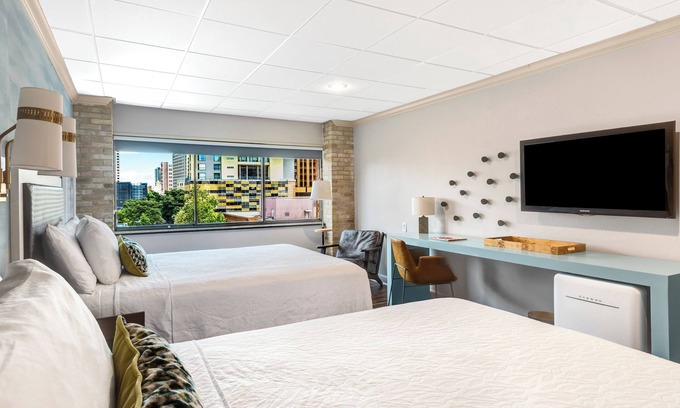Our 2 queen beds room with a view looking into the heart of San Antonio.