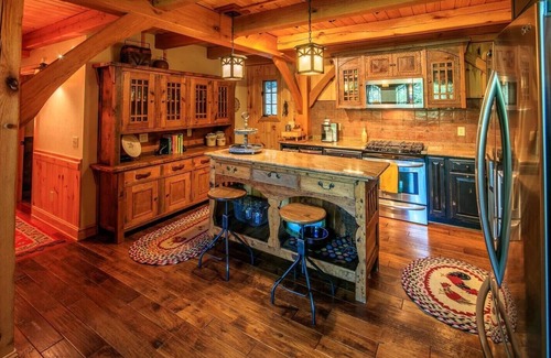 For those of you who appreciate design, you'll be inspired by the architecture and the remarkable details of this cabin. Really, “cabin” doesn't do the house justice—this home's a galaxy away from what we think of when we think of Daniel Boone! Wherever your eye comes to rest, you'll be delighted! Vaulted ceilings, architectural detailing, bark and stone siding, Prairie-style windows, fabulous lighting fixtures, plus a perfectly designed kitchen with an island, stone counters, stainless appliances (including a beverage fridge) and two toned cabinetry—that's just the start of the arresting details! Bathrooms have furniture-style vanities and gorgeous stone tile showers and the master bathroom has heated stone floors, perfect for chilly mornings.