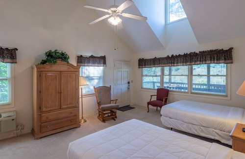 These mountain villas each have 2 bedrooms with their own private full bath. They can sleep up to 8 in 4 queen beds. The open concept living room, dining room, and kitchen is a wonderful spot to enjoy a home-cooked meal, game night, or a relaxing night in. The beautiful setting at the base of Cold Mountain will make you wish you never had to leave.