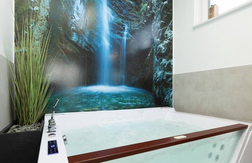 WC, washbasin, mirror, towels, hairdryer, whirlpool bath, shower