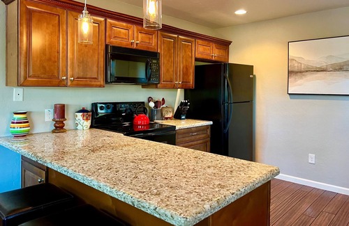The open kitchen is well-equipped with all the dishes, pots, and pans you’ll need—just bring your food and clothes!