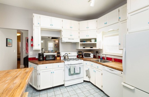 Nice kitchen with a breakfast bar that seats 4 people and completely outfitted with all the cooking gear a chef would need. Gas range/oven. The door off the kitchen takes you out to the patio with gas grill, a patio table set that seats 4 for outside dining in the spring, summer, and fall. Additional outdoor seating with plastic Adirondack chairs, two sunning chaise loungers with cushions, and a hammock. Dining area in living room with a table that seats 6 comfortably and has an additional leaf extension to accommodate 8.