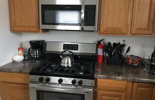 New modern appliances such as, refrigerator, stove, oven, microwave, dishwasher and coffee maker.