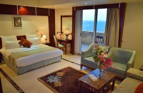 Standing on the Mediterranean shore in Alexandria, this 4-star hotel is located in the elegant Saba Pasha district. All rooms host panoramic sea views and there are 2 gourmet restaurants to choose from. Romance Alexandria Hotel offers spacious accommodations with carpet floors, wide floor-to-ceiling windows, and light neutral colors. Each room has satellite TV and a mini-bar. Fine French cuisine can be enjoyed for dinner at the air-conditioned Le Clovis. Local and international dishes are served at Mermaid coffee shop, open for breakfast, lunch and dinner. Romance Alexandria Hotel is located 0.6 mi from the Stanley Bay beach area. Alexandria El Nohza Airport is 6.2 mi away.