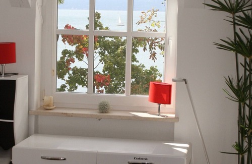 This exceptional and beautifully furnished apartment on the second and last floor of a multi-party villa with direct lake access offers a large south-west facing balcony with a 180° view of the lake and the Alps. Here you can enjoy the spectacular atmosphere of the lake and romantic sunsets. There's always something to look at, be it the sailboats passing by or swaying in the wind, passengers boarding the ferries or the windsurfers and kiters carving in the water. The lake sometimes appears wild, sometimes gentle - and in the evening the flickering of the waves reflect on the ceiling of kitchen.