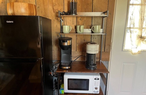 Inside, you’ll find a warmly furnished living area, complete with sofa, TV, and electric fireplace for added coziness. The kitchenette has everything you need to prepare a full meal or simply enjoy a fresh brewed Nespresso cup of coffee. The kitchen is also stocked with cooking supplies, including a waffle maker (complete with mix and syrup for a quick homemade breakfast!). The bedroom has a comfortable queen bed, with full bath facilities, including a walk-in shower, sink and toilet.