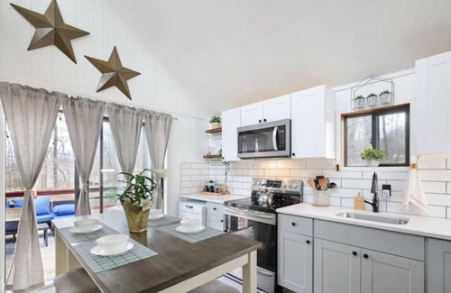 The Dolce Vita Cabin consist of two bedrooms, one bath plus a very charming open Loft. Master bedroom includes a king size bed, reading corner and Fire TV. Second Bedroom includes a Full size bed, 2 side tables and modern desk. The open loft has two twin beds, an open space to play board games, a 32 inch smart TV and lounge corner. The open living/ dining space is perfectly design to host the most romantic diner. Turn on the gas fireplace and watch a movie on a 55inch TV. The kitchen is fully equipped with a full size stove and oven, toaster, toaster oven, blender, pots and pans, silverware, plates, glassware and a coffee station ( French press, beans grinder, traditional electric coffee maker) Just steps away, walk into the deck area and enjoy a gas BBQ, diner al fresco, seating area and Hot tub. You are also welcome to use our wood firepit while seating on your own Adirondack chair.