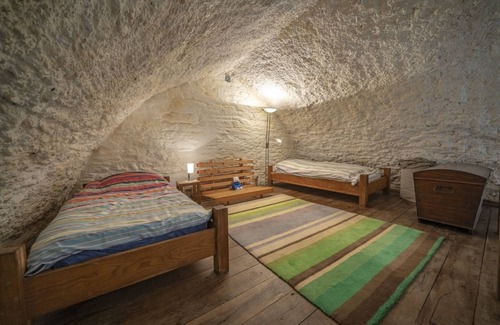 Sleeping facilities are rustic, there is one double Futon bed on the first and two single beds on the second mezzanine. The old garderobe now functions as a toilet for guests who sleep on these floors. The top room accommodates a very comfortable Queen Size bed, a large couch with coffee table, an art deco desk with chair and a small open fireplace for chilly nights. A shower room is attached on the top floor.