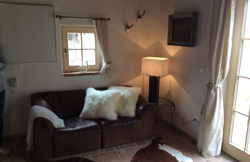 The Alpine-style chalet has wooden furniture, a flat-screen TV, a kitchen, bathroom, and 2 bedrooms. There is also a pool on the property, a grill and a cottage garden - everything can be shared.