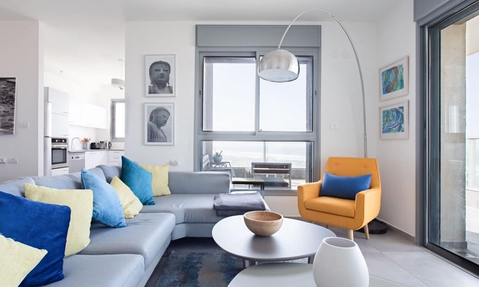 A luxurious 2 bedrooms, a large living room overlooking 180 degrees of the Mediterranean Sea, a large dining area seats 8 guests. Full kitchen with stainless appliances. The apartment is Located on the seafront of Bat Yam, just 7-10 minutes from the center of Tel Aviv, Israel's vibrant and exciting coastal cultural capital. Just a short walk, you are on a golden sandy beach with cafes and great swimming and boating possibilities. The apartment is beautifully furnished with designer pieces and original artwork. You can lounge in the living room and view the fabulous beach and sea view. There's also a large sun balcony with a seating area, Free WiFi, 42" and high-definition TV, and Netflix to help you enjoy your stay. There is a wide range of restaurants and shops within walking distance, good public transportation, and a new subway to all points in Tel Aviv.