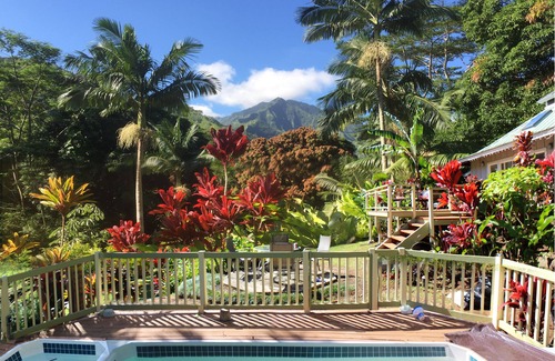 Tucked away on over an acre of lush paradise along the Wainiha Stream in an ancient grove of 100 ft. tall mango trees lies the Hale Wainiha. Offering privacy, rest and refreshment, this charming home sits on a bluff overlooking an expansive view of the entire river valley with neighboring taro farm and spectacular vistas of distant mountains. Relax and enjoy the amazing views from the deck or from your private pool and hot tub. Starry nights in the hot tub are truly magical. And the pool is cool and refreshing after a hot day at the beach. Or the perfect morning wake up. The large yard is like a botanical garden filled with exotic birds and flowers and fruit trees. Pick a Papaya or a Banana, cut some giant Heliconia flowers. This lush valley is a serene retreat, nourishing the soul with natures greatest beauty while offering all the modern comforts of home, you almost won't want to leave the property. But when you do, it is ridiculously close to the best beaches on the island, Tunnels, Lumahai, Ke'e and Hanalei. Firstly, Lumaha'i, just 1 mile away, with its long deep stretches of soft sand broken by picturesque protrusions of lava rocks creating dramatic ocean breaks. Tunnels Beach has an amazing reef and offers the best snorkeling on the island, also surfing and the mountain backdrop creates amazing views. At the end of the road is the dramatic Ke'e beach. Besides its great snorkeling, and sunsets, this is the gateway to the amazing Napali Coast offering one of the worlds most spectacular hikes. The 2 mile hike to Hanakapia'i Beach with it's expansive ocean vistas is a 'must do', but if you can do the additional 2 miles to the Hanakapia'i Falls you're in for the treat of a lifetime. A large pool fed by a 300' waterfall, just spectacular!! Wainiha is surrounded by the best snorkeling, surfing, kayaking and hiking on all of the Hawaiian islands. You'll never have to leave this magical corner of the island.
