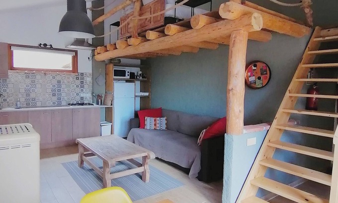 Cozy duplex apartment with all comforts with open living space with kitchen, living room and dining area. There is a separate bathroom on the ground floor and a bedroom on the first floor with a double bed. Furthermore, the apartment has a small private terrace with picnic table and sun loungers that offers a view of the mountains.