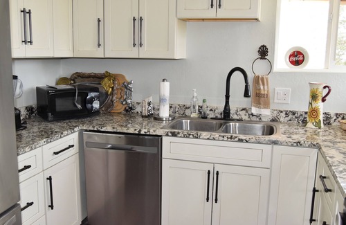Situated in the boulders of Prescott Arizona's beautiful Granite Dells area. This cozy cottage is ready for your romantic getaway, honeymoon, or for a couple who are looking for an affordable weekend or a monthly retreat. Do you like to write? This home would be the place to awaken those creative juices! The home sleeps 2 but a guest/child could sleep on the comfy couch or the blow up full mattress. The Cottage boasts a large 1 bedroom with a queen bed, a wonderful outdoor deck with a patio heater and outside furniture. Once you step out onto the deck, it will be hard to leave as you gaze out over majestic boulders and spot wildlife of all kinds. Located close to downtown but far enough away to feel secluded. Hiking trails and climbing nearby. This home is fully stocked and ready to go! Oh... did I mention the view? Check out the pictures! You will not be disappointed. Sleeps 5 / Couch and Blow up Mattress.
