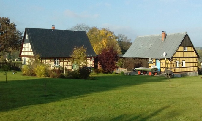Enjoy relaxing days in our newly built half-timbered house. Feel the unique indoor climate of the mud house, pleasant coolness in summer and cozy warmth in winter. Allergy sufferers estimate the constant humidity of 50% even during the heating season. If you are looking for peace and relaxation, only neighbor Gockel will remind you of country life. And on cold winter evenings, our historic tiled stove provides cozy warmth. But you don't have to do without comfort. Underfloor heating on the ground floor and radiators on the upper floor ensure pleasant temperatures. You can park your car directly in front of the house in our courtyard. Are you curious? Then book in Vogtland's only new adobe house since 1803!