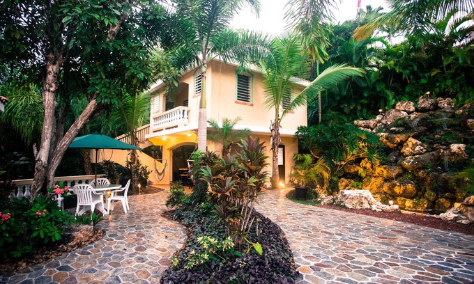 The Honeymoon Suite is complete with a queen bed, kitchen, couch, TV, private balcony and a/c. This studio is on the second floor above our private bar which is closed unless a guest requests to open it. Along with the bar on the first level there is a beautiful seating area, with hammocks and tables, next to our private waterfall. If no guests are staying in our other rentals or if you are part of the group booking, you have access to either our private infinity pool that has great ocean views or the swimming pool at the lower house. The outdoor staircase leading from the infinity pool down to the Honeymoon Suite is picturesque - great for weddings or Instagram moments. We also have a large event pavilion that is open to all guests. If you are planning an event you can request private access. The event space can accommodate 100 people and is complete with lounge chairs, couches and hammocks. If it is not being used for an event, it is a great place to hang out and read a book.