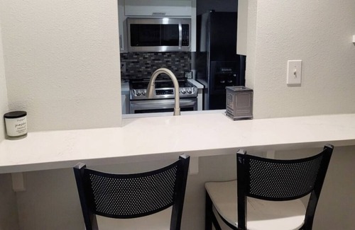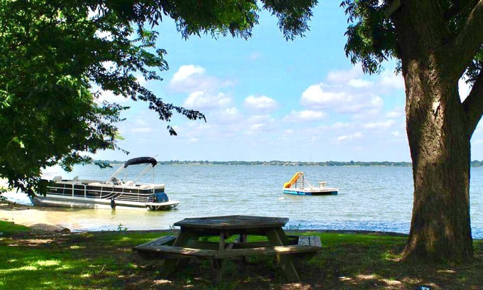 Great Romantic getaway with great view of the sunset at the lake and Dallas Skyline. Your backyard is equipped with a gas grill as well as outdoor seating, great activity to enjoy the lake view. the living room is cozy and you are able to start a fire at the standing fireplace. Enjoy a movie with your loved ones with our great-sized tv screen, and prepare a snack at our kitchen.