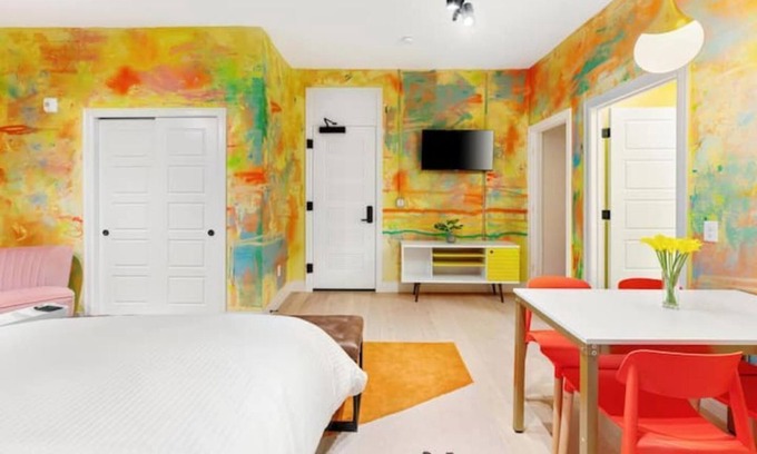This unique place has a style all its own. Abstract artist Romelle is known for colorful, energetic work that explores the modalities of healing with color. This spacious studio comes equipped with a pillow top queen bed, kitchenette, and glass tiled en suite bathroom. Work from home with blazing internet speeds, or venture out to the many coffee shops, and restaurants steps from our door. Our central location provides the perfect launch pad to all of your travel and business needs in Denver.