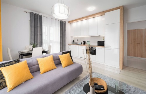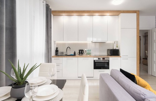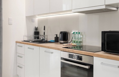 Rondo Wiatraczna Deluxe Apartment features a stylishly decorated living room with a sofa bed and kitchenette, two separate bedrooms with a comfortable double bed and two single beds, a bathroom, and a spacious balcony where guests can relax and enjoy a morning coffee or an evening glass of wine. Guests have access to a range of practical amenities, including free WiFi, cable TV, a washing machine, iron, hairdryer, fridge with freezer, dishwasher, oven, microwave, toaster, and kitchen utensils. A parking space in the garage is also available for guests. Additionally, the apartment is equipped with air conditioning, providing exceptional comfort, especially during hot days.