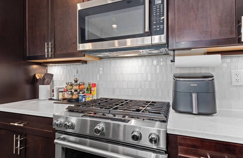 • Fully stocked kitchen with air fryer, blender, toaster, electric kettle, dishwasher, barware, and cooking essentials