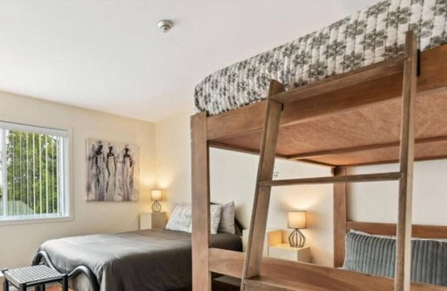 Room 7, named L'Audacieuse, is offered by Domaine ALPINEA located in Saint-Donat De-Montcalm. This room is ideal for a small family, with a double bed and 2 single bunk beds. It is comfortably furnished with a chest of drawers, a chair and small decorative blocks serving as a bedside table, offering a magnificent view of Mont Sombre.