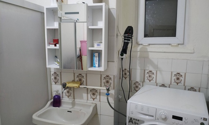 Bathroom: washing machine,dryer,iron,ironin table ,shower,hair dryer,hoover