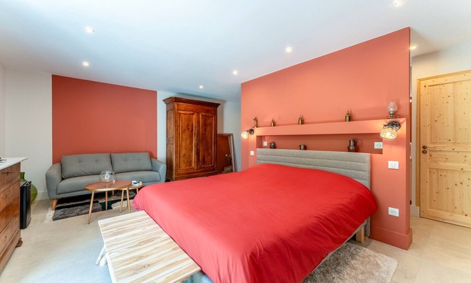 The Suite Sylviane room in Les Angles offers 37 m² and can accommodate up to 2 people. You have a bedroom with a king-size bed (180 x 200 cm) and a bathroom with separate toilets. Located on the first floor, the room is furnished with renovated antique furniture in terracotta tones, creating a warm Provençal atmosphere. The curtains let in natural light and offer a pleasant view of the garden. Your private amenities include air conditioning, a television, a workspace, a minibar, and breakfast included. As the property is close to a main road, you may hear vehicle noise from the garden.