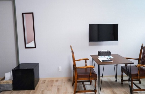 There are snacks and restaurants on the 1st floor / Two semidouble beds unit bath TV refrigerator empty air conditioner table and two chairs are installed
