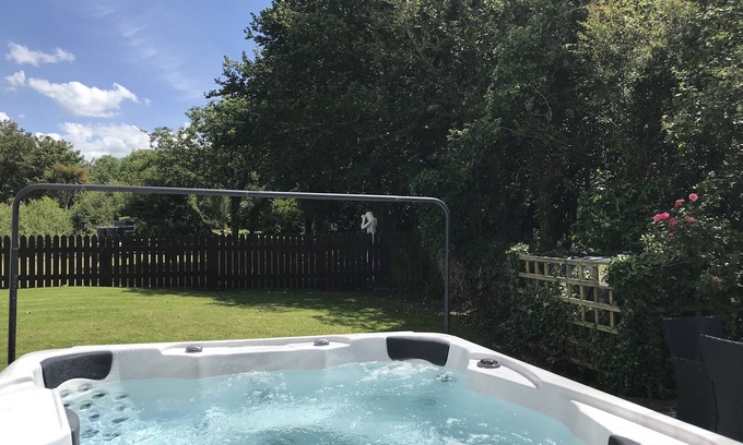 The garden features a stunning large hot tub which can be added to bookings for a surcharge (£135) the decking area is accessed by patio doors from the round house and BBQ area with table and chairs next to the hot tub through Frenchdoors from the dining area .
