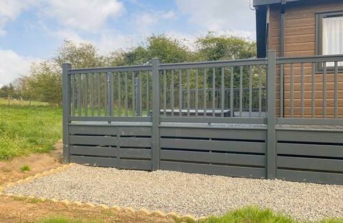Bathroom: Bath With Shower Over, Toilet. Gas central heating, gas, electricity, bed linen, towels and Wi-Fi included. Travel cot available on request. Welcome pack. . Back garden with patio and sitting-out area. Grounds with children’s play area (shared with other properties on-site). Hot tub for 4 (private). Bike store. Private parking for 2 cars. No smoking. Please note: This property has a security deposit of £100.. This spacious lodge is tastefully furnished throughout, with careful attention to detail to ensure you have a memorable stay. You are tucked away from the road with a sweeping gravelled driveway, with your own private patio area where you can sit out in the sunshine, as well as take a dip in your hot tub. From here you have wonderful views over the open field before you, with the hills beyond, at night this is a fabulous spot for star gazing.