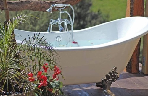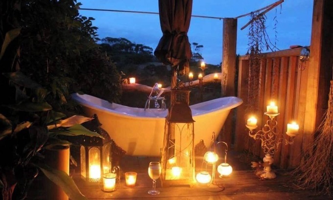 Mood lighting, fresh flowers, pure lavender soap and bath crystals for your outdoor bath experience.
