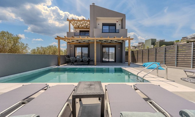 Rosy villas collection is a unique and stylish complex of villas offering the perfect setting for families, couples, or groups of friends seeking a relaxed yet well-connected holiday experience in Crete. Blending modern architecture with comfort and privacy, this elegant property accommodates up to 20 guests and consists of three fully independent properties, Rosy 1 & 2 identical villas and Little Rosy ,ideal for enjoying time together while preserving personal space and comfort. Rosy 1 & 2 are two identical villas next to each other. Each villa : accommodates up to eight guests each, features three elegant bedrooms and a convertible sofa bed in the living room. On the ground floor, guests will find a bright, open-plan living space complete with a cozy fireplace, smart TV, fully equipped kitchen, and a dining area for eight. This level also includes a serene double bedroom with its own veranda and a modern bathroom with a walk-in shower.Upstairs, two more thoughtfully designed bedrooms await, one with a double bed and the other with two single beds, sharing a spacious, sunlit bathroom with a walk-in shower. Each bedroom opens onto a private balcony, allowing guests to enjoy calming views and abundant natural light. All bedrooms are equipped with smart TVs, and the villa features air conditioning throughout and high-speed Wi-Fi for total convenience.Step outside to your private oasis: a 28 sqm swimming pool (7m x 4m, 1.5m deep) surrounded by sun loungers, beanbags, umbrellas, and a refreshing outdoor shower. Enjoy al fresco dining in the outdoor BBQ area, perfect for long, leisurely meals under the Cretan sun.Next to villa Rosy 2 is Little Rosy, is a stylish and cozy 65-square-meter haven, thoughtfully designed in a modern mezzanine style. Perfect for couples, small families, or friends, this retreat offers a peaceful and charming escape in the heart of Crete.Blending contemporary design with homey comfort, the open-plan layout features a bright living area with a fireplace, a smart TV, and a plush convertible sofa bed—ideal for accommodating two extra guests. The fully equipped kitchen includes a central island with four stools, perfect for enjoying breakfast, cocktails, or shared meals.On the main level, you'll also find a spacious bathroom with a sleek walk-in shower. A wooden staircase leads to the airy mezzanine bedroom, where a cozy double bed rests beneath high ceilings, creating a warm and inviting atmosphere. The bedroom also includes its own TV for added comfort. Throughout the home, you'll enjoy air conditioning and high-speed Wi-Fi for maximum convenience.Step outside and immerse yourself in relaxation. Unwind in the private jacuzzi (fits up to four guests,operating times from 09.00 to 19.00), lounge on the sunbeds beneath umbrellas, or enjoy alfresco dining in the outdoor dining area, complete with a BBQ—perfect for long, leisurely meals under the Cretan sun.All the 3 properties are connected as the gates between them can be open. Ideally located just a 10-minute walk from one of Crete’s largest waterparks (open may to october) and a short drive from the lively resort town of Hersonissos, the property offers the perfect balance of tranquility and access to beaches, restaurants, and nightlife. Just a short drive from Heraklion Airport and the scenic towns of northern Crete, this charming retreat is your perfect base for a romantic escape or a memorable small-group holiday.