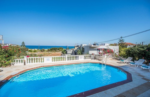 The superb sea view from either the balcony, bedroom or living area through the floor to ceiling patio doors is what makes Rouladina Apartment 5 extremely popular. Set amongst a patchwork of green vineyards on the hillside just 500 metres from sandy Stalos (https://www.freelancevillas.com/stalos-villas/) beach, Rouladina Apartment 5 is one of a group of just 6 apartments in a quiet neighbourhood. Since they were first introduced to our program, the Rouladina Apartments have proved consistently popular and guests return year after year. They come back, not only for the location and comfort of the apartments, but for the warm welcome from the owners, Manolis and Dimitra. They have their own apartment and take care of the property and their guests with a perfect combination of discrete Canadian/Greek efficiency and genuine Cretan hospitality.Location StalosJust a short stroll downhill from the apartments there is a choice of several tavernas, shops and mini markets. Opposite the apartments is a family run taverna which has been approved by several guests as well. The long sandy beach of Stalos runs for 7kms merging with Agia Marina and Platanias, which are more bustling in peak season vs the low key Stalos beach. There is a regular bus service to Chania (https://www.freelancevillas.com/chania-villas/) on the main road in Stalos. Shared Facilities at Rouladina ApartmentsShared Swimming Pool - 10m x 5m swimming pool. Depth 1.1m - 2m.Sea View Poolside Terrace - furnished with sunbeds and umbrellasReception area - library and luggage storage (for arrival/departure day), shower, WC and washing machine. Rear Terrace – peaceful rural views of the vineyards stretching away up the hillside, sunbeds, table and chairs with umbrella (this terrace is shared with No 6 only). Outside Rouladina Apartment 5 - second floor apartmentPrivate terrace – Sea view furnished with table and chairsBedroom terrace –Sea view and rattan comfy chairs.Inside Rouladina Apartment 5Open plan living room Sitting area – L shaped sofa (sofa-bed), full-length patio windows with sea view, local TV and air con unit. Dining area - wooden dining table and chairs. Kitchen - Wooden cupboards, electric oven with hobs, double sink and fridge freezer.Double bedroom - 1 double bed, wardrobe, ceiling fan, full-length patio windows balcony with sea and pool views. Twin bedroom with en suite shower room - 2 single beds (can be placed together), wardrobe, ceiling fan, window to side. Shower room, hand basin and WC.Family bathroom - full bath with shower attachment, wash hand basin and WC.A 5th person can be accommodated on the sofa-bed HousekeepingYour apartment will be prepared for you on arrival with fresh bath and hand towels and all beds made up. For stays of 7 nights or more - house towels will be changed every 3 - 4 days. For stays of 14 nights or more - bed linen will be changed every 7 days. Pool/beach towels - one per person for the duration of your stay.ParkingOn site there is parking for four cars plus ample off road parking.