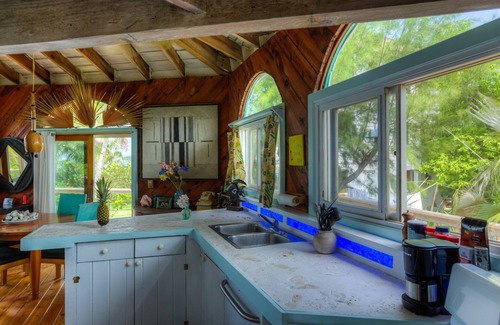This beachfront vacation cottage is built of cedar in an open hexagonal design, with a high ceiling and a sleeping loft, ideal for children. Eight arching windows provide magnificent views, and open onto a wrap-around 360 degree deck with outdoor shower. There's a split level A/C unit. On the beach we have a thatched cabana with comfortable lounge chairs.